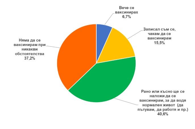 Делът на заявяващите, че няма да се ваксинират при никакви обстоятелства възлиза на 37,2%, като подобна позиция по-често се среща сред хора на възраст под 40 години и сред жители на малките градове и села в страната.