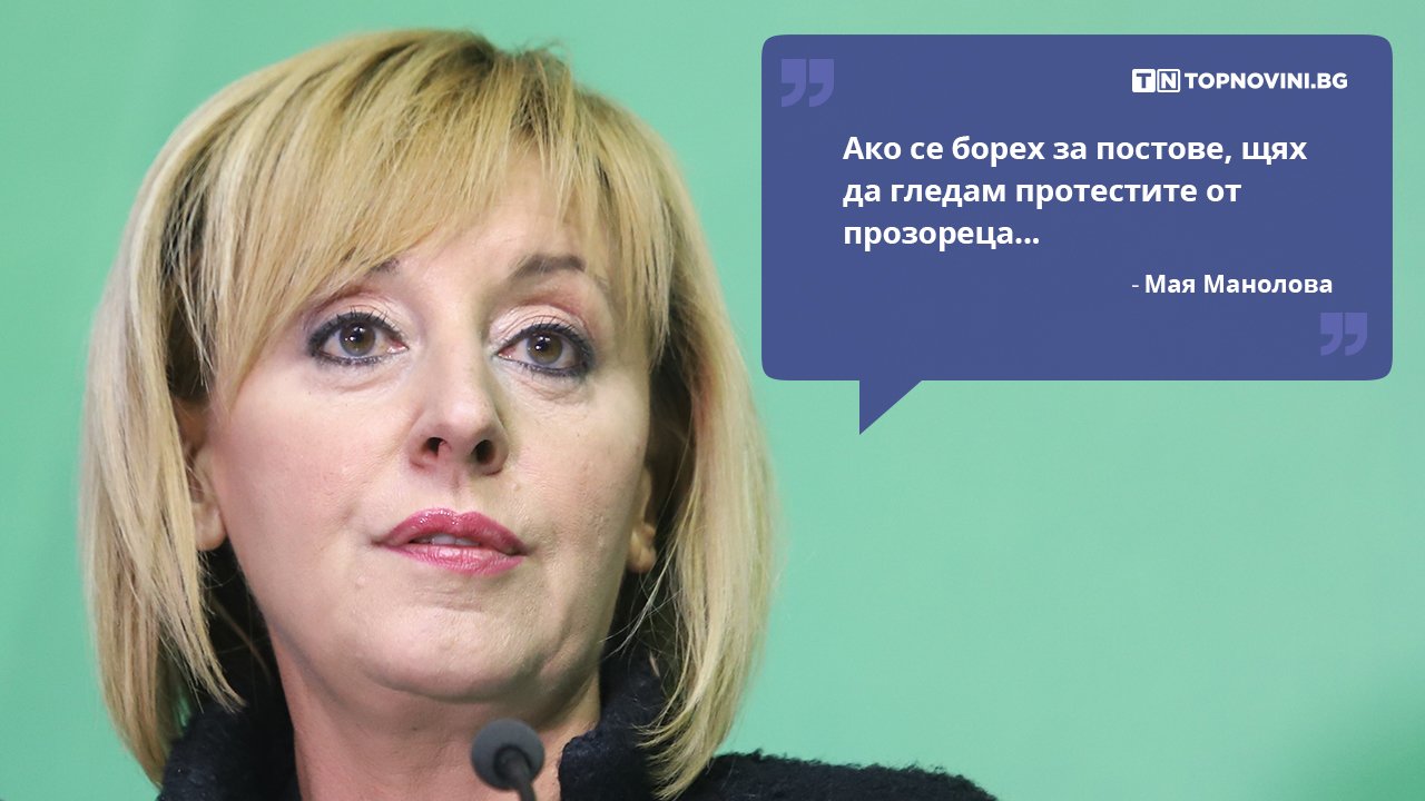 „Никой от нас (бел. ред.- коалицията „Изправи се! Мутри вън!“) не се бори за постове. Ако аз се борех за постове, щях да съм омбудсман. Щях да си седя в омбудсманския кабинет, да имам най-високия рейтинг, да получавам висока заплата и да гледам протестите от прозореца”, каза Мая Манолова, водач в 23 МИР София и Стара Загора от „Изправи се! Мутри вън!” в ефира на Нова телевизия.