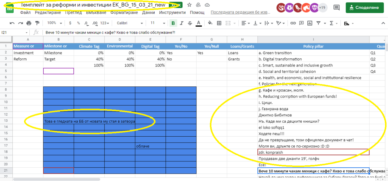 Изобретателните читатели решиха да допълнят плана за реформи и инвестиции с поръчки за кафе, газирана вода и мекици, оферта за продажба на автомобилни джанти. В документа се виждат и нашумели фрази в интернет „Есе“, „Zdr ko praish“, „Ходете пеша“ и др.