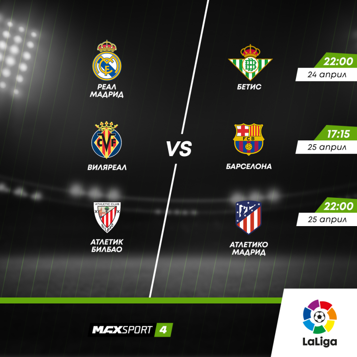 От тези близки изходни позиции трите отбора влизат в поредния кръг, като всеки от тях има наглед доста трудни мачове. Първи на терена ще излезе Реал Мадрид, който посреща Бетис в събота вечер от 22:00 часа. В неделния ден от 17:15 часа Барселона е гост на силния тим на Виляреал, който се бори за място в Лига Европа, а от 22:00 часа Атлетико Мадрид гостува на баските от Атлетик Билбао. И трите мача ще се излъчат пряко по MAX Sport 4.