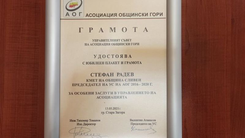 Асоциация „Общински гори“ удостои кмета на Сливен Стефан Радев с юбилеен плакет и грамота за особени заслуги в управлението на асоциацията. Наградата му бе връчена лично от изпълнителния директор инж. Тихомир Томанов. Стефан Радев беше председател на организацията в мандат 2016-2020 г.