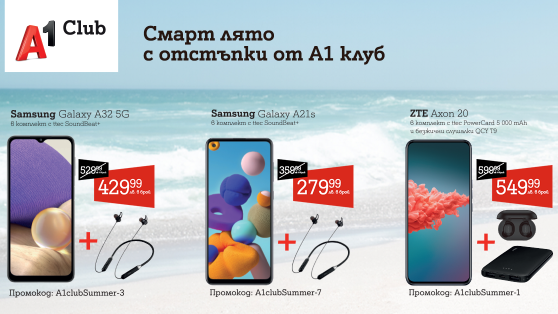 Така настоящите клиенти могат да спестят до 150 лева от следващата си покупка в онлайн магазина на А1. Промокодовете за всички устройства с намаления могат да бъдат открити на А1.bg/a1club-summer. В кампанията са включени ZTE Axon 20, Samsung Galaxy A32 5G, Samsung Galaxy A21s, както и джаджите Huawei Freebuds Studio, Huawei Eyewear II и Huawei GT 2 Pro.