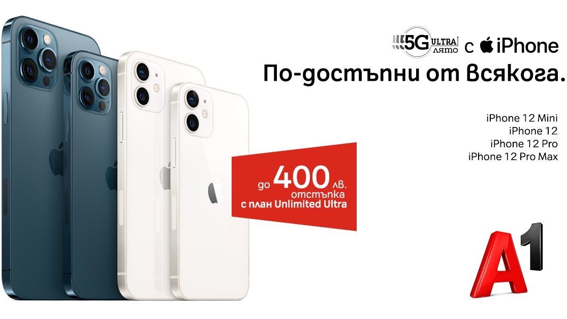 Любителите на бранда iPhone имат невероятната възможност да закупят устройство от серията 12 на значително по-ниски цени до края на август. А1 намалява цените на iPhone 12 mini, iPhone 12, iPhone 12 Pro, както и на топ флагмана – iPhone 12 Pro Max. Намаленията важат при покупка с договор за тарифен план Unlimited и достигат до 400 лева. Промоционалните условия ще останат в сила до края на месец август.