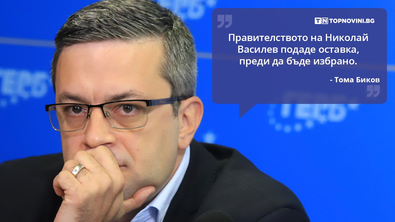 „Правителството на Николай Василев подаде оставка, преди да бъде избрано.“ Това написа Тома Биков от ГЕРБ, след като Слави Трифонов обяви, че оттегля кандидатурата на Василев за премиер и ще ревизира предложения от него кабинет.