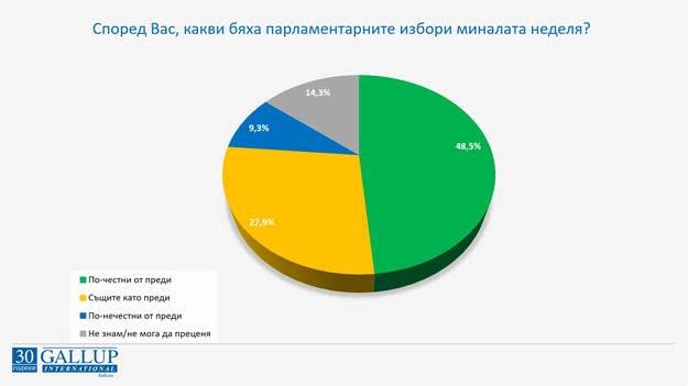 Почти всеки втори гласоподавател определя отминалите на 11 юли избори като по-честни от преди. Това показва следизборен сондаж, осъществен от „Галъп интернешънъл болкан“ между 14 и 16 юли сред 816 пълнолетни българи по телефона.