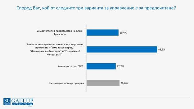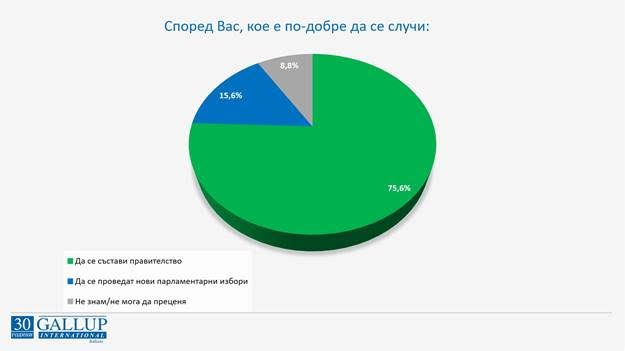 Българите все повече очакват правителство, но липсва сигурността, че ще го има. 75,6% избират опцията „правителство“, пред опцията „нови избори“ (15,6%). В същото време обаче липсва сигурност, че парламентът ще успее да състави правителство. 47,5% предполагат, че той няма да успее, а 39,9% - че ще успее. Останалите се колебаят. Данните показват ръст на очакването за правителство, в сравнение с предишни други сондажи на „Галъп интернешънъл болкан“.