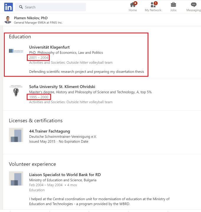 Според профила на Пламен Николов отворен през мобилното приложение на Facebook (което дава повече детайли и дати), участието му в докторската програма е било в Alpen-Adria-Universität Klagenfurt през учебната 2003 г. Трето разминаване до момента е периода на обучение, според LinkedIn докторантурата е в периода 2001 г. – 2004 г.