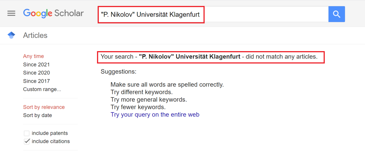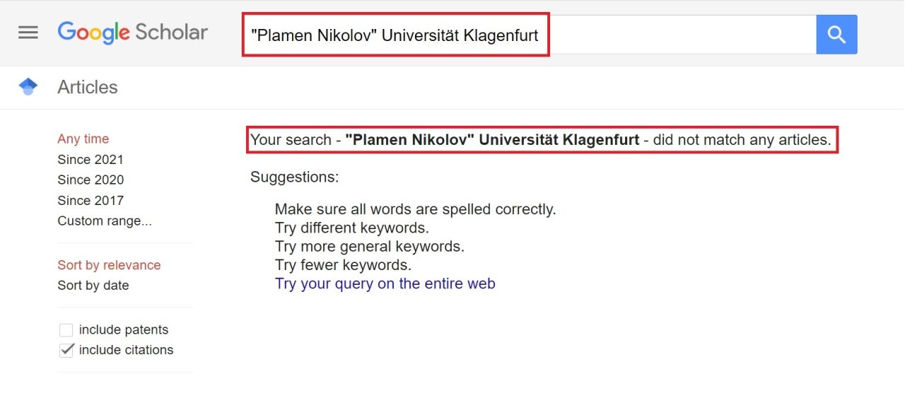 Проверка в Google Scholar не открива и научни публикации, в които „Plamen Nikolov“ или „P.Nikolov“, се споменават в контекста на същия университет.