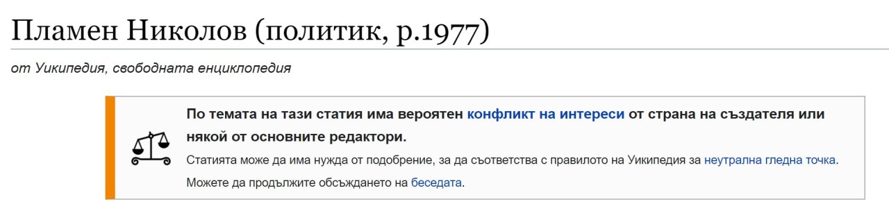 В свободната енциклопедия Wikipedia страницата за „Пламен Николов (политик, р. 1977)“ е чисто нова. Създадена броени дни преди името му да бъде обявено като евентуален премиер – на 26 юли 2021 г. от анонимен потребител.