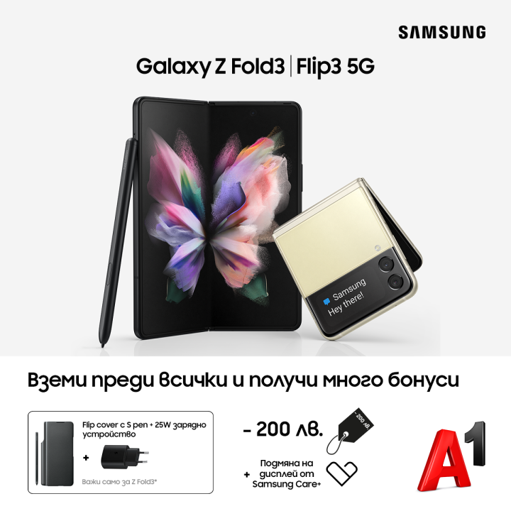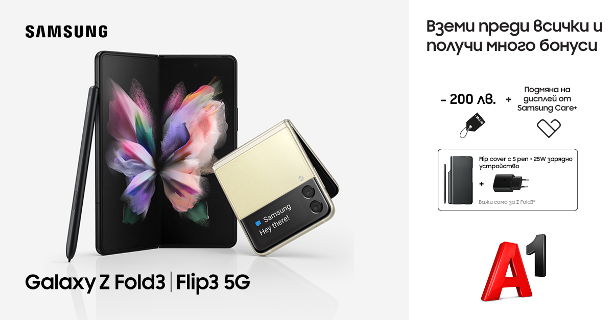 А1 предлага новите сгъваеми смартфони Samsung Galaxy Z Flip3 и Samsung Galaxy Z Fold3 на преференциални цени – с 200 лева по-ниски. Най-новите представители на Z-серията на производителя поддържат 5G ULTRA мрежата на А1 и гарантират подобрения в технологията, която позволява прегъването на дисплея.