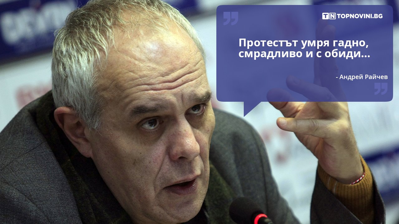 „Протестът, който се роди на 9 юли миналата година и имаше одобрението на 60% от българите, умря. Имаме труп. След 13 месеца съществуване, днес той умря гадно, смрадливо и с обиди... Да си викат болонки и т. н.“, така социологът Андрей Райчев коментира неуспешния опит да се реализира първият мандат за съставяне на правителство в рамките на 46-ото Народно събрание.