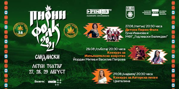 За всички почитатели на хубавата македонска музика в чужбина трите фестивални вечер на „Пирин Фолк“ Сандански 2021 ще се излъчват на живо във Facebook страницата и YouTube канала на Фен Фолк ТВ - Fen Folk TV.