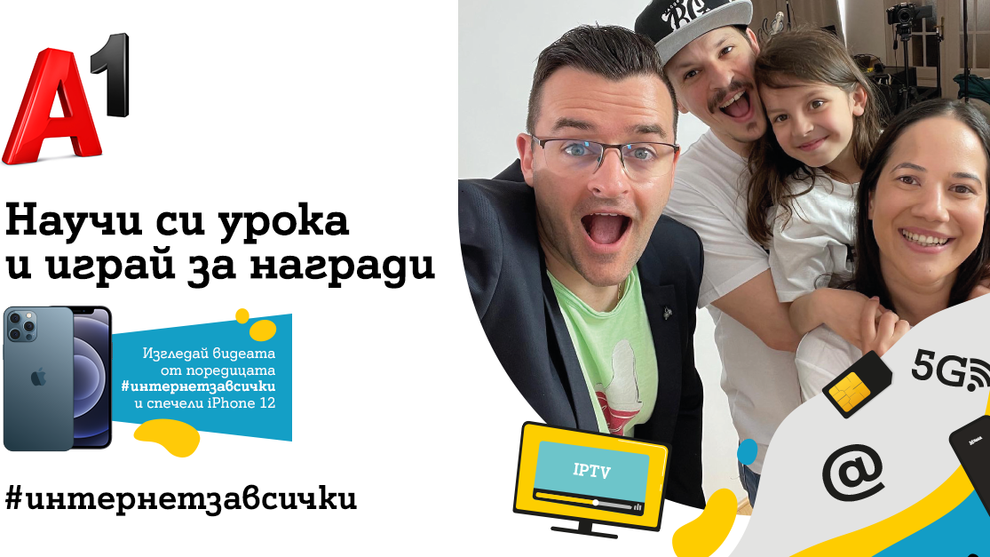 Превърналата се в традиционна кампания „Интернет за всички“, с която А1 разяснява как работят високите технологии на деца и младежи, тази година ще се проведе изцяло онлайн на специално създадения за целта сайт - internetforall.bg. В рамките на шест образователни видеа Слави Панайотов от The Clashers, с помощта на Ивайло и Християна от ‘Айде БГ, разказва интересни факти за мобилните мрежи, интерактивната телевизия, SIM-картите и облачните услуги. Тези, които внимават в „часовете“ и се справят с кратък тест, ще играят за награди от А1 – 3 броя iPhone 12, както и 10 броя Apple АirPods Pro.