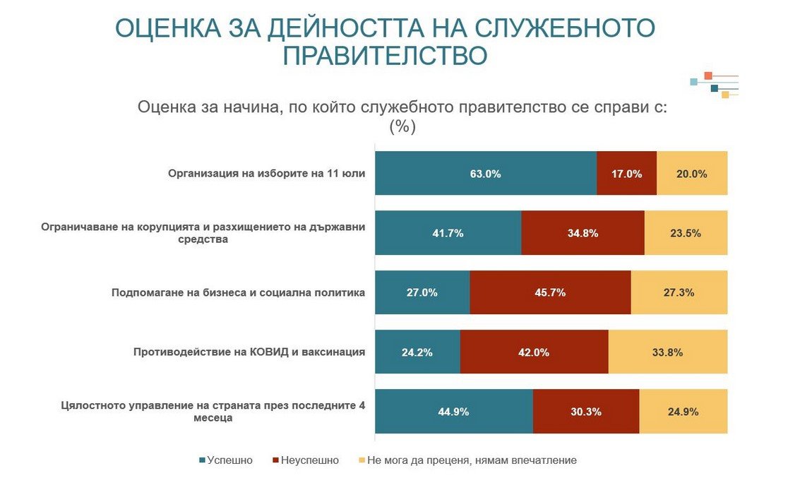 Като най-слаби се оценяват действията на кабинета по ограничаването на Ковид пандемията и ваксинацията – 24.2% положителни, срещу 42% отрицателни мнения. В резултат, цялостната дейност на служебното правителство до този момент се ползва с 44.9% одобрение, срещу 30.9% неодобрение. Служебният премиер Стефан Янев е с по-висок рейтинг от кабинета – той получава 48.7% положителни оценки, едва 18.9% отрицателни, а почти всеки трети (32.4%) няма определено мнение.
