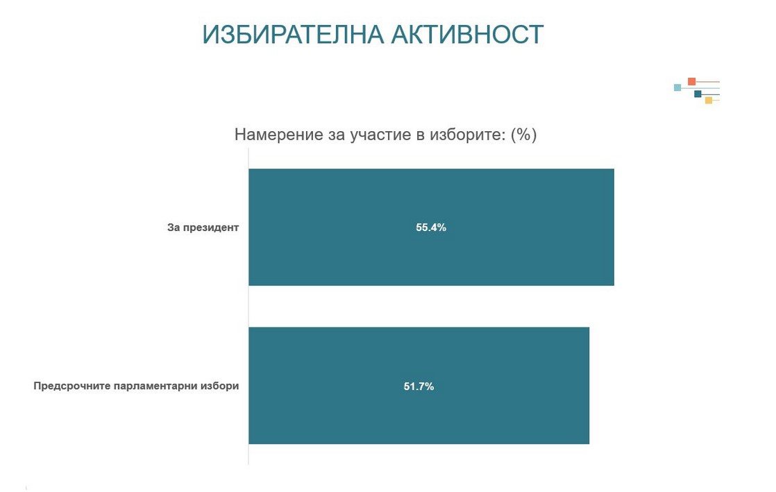 Непосредствено преди разпускането на парламента 51.7% от пълнолетните граждани декларират готовност да участват в следващите парламентарни избори, а 55.4% - в президентските. Тъй като президентските избори по принцип теглят вота нагоре, може да се предполага, че ако кампанията не протече по начин, който да отврати избирателите и ако не възникнат технически затруднения, над половината пълнолетни българи биха упражнили правото си на глас.