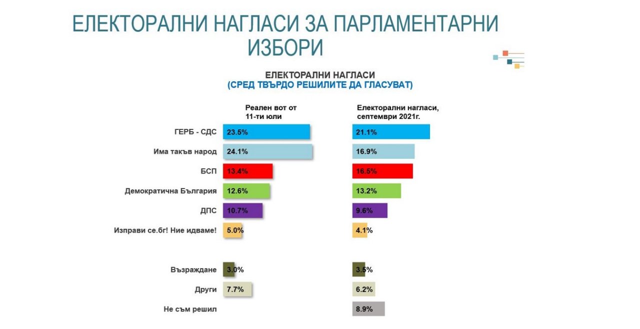 Най-големи щети търпи победителят от изборите на 11 юли, ИТН, към когото имаше и най-големи нереализирани очаквания. С 16.9% от твърдо заявилите намерение да гласуват, партията на Слави Трифонов бележи спад от над 7 процентни пункта спрямо резултата си от парламентарните избори и логично губи първото място. То вече се заема от ГЕРБ, който не повишава резултата си, но съумява в голяма степен да запази твърдите си привърженици (21.1%).