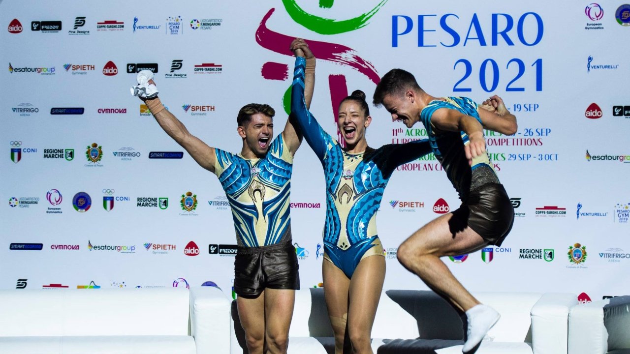 На върха на почетната стълбичка в Пезаро се изкачиха и Ана-Мария Стоилова и Антонио Папазов в категорията „смесени двойки“ при мъжете и жените. След Анна - Мария и Антонио почетната стъбличка допълниха състезателите на Унгария - 22.200 и от втория отбор на домакините от Италия - 22.100 точки. Останапите отбори в топ осем са Румъния (втори отбор), Турция (първи отбор), Италия (първи отбор), Украйна (първи отбор) и Румъния (първи отбор).