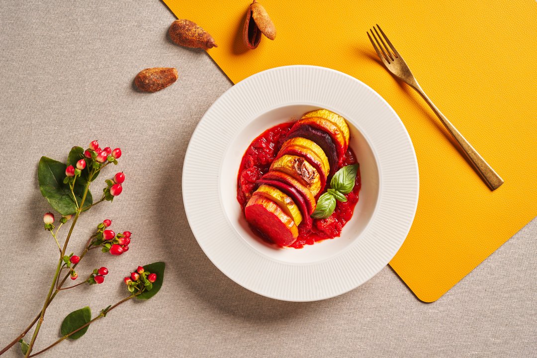 За рататуй с кореноплодни зеленчуци шеф Шишков залага на сезонните продукти - цвекло, сладък картоф, тиквички и няколко вида патладжан, а за ароматния сос - белени домати, лук, чесън и малко масло. Тайната за добре приготвения рататуй се крие в предварително подготвените съставки - така всичко става бързо и вкусно, пояснява шеф Шишков.
