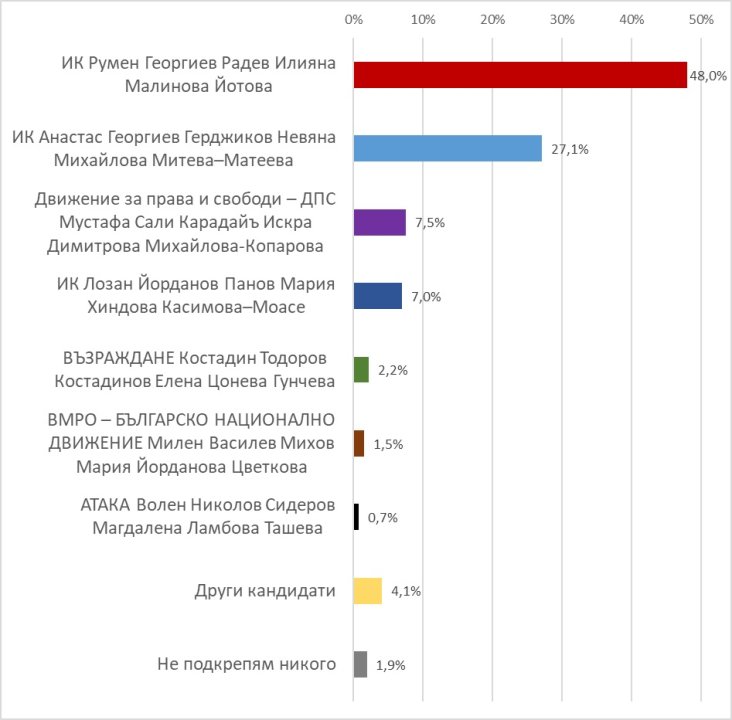 Балотаж ще има, ако се запазят тенденциите към 5 ноември. При балотаж, сигурни участници в него са сегашният президент Р. Радев и проф. Анастас Герджиков. Към 5 ноември резултатът от подобен балотаж би бил 63.5%: 36.5% в полза на сегашния президент на страната. Дълбочинният анализ на Екзакта показва, че Р.Радев има значително по-голям ресурс от А. Герджиков при балотаж сред политически изкушените избиратели, както и сред нерешилите кого да подкрепят за президент.