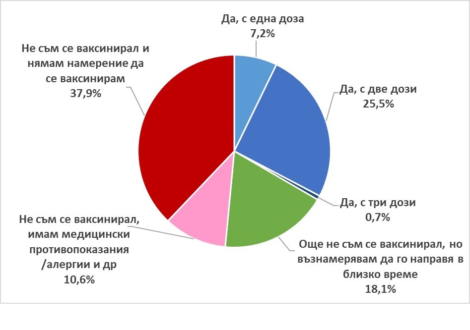 11% изтъкват като причина да не са ваксинирани медицински противопоказания. 38% посочват, че не са ваксинирани до момента и, че нямат намерение да се ваксинират.