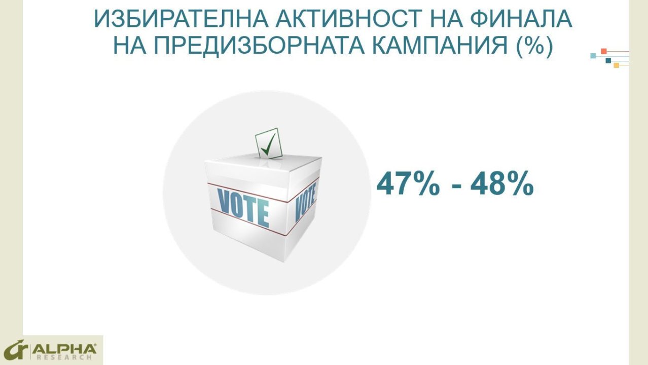 Повишена мобилизация за парламентарния вот, който седмица преди изборния ден привлича по-висок интерес от президентската надпревара. Консолидиране на партийните ядра в периода на кампанията и битка за електорални периферии в последната седмица преди вота и значима дистанция между основните претенденти за държавен глава, но недостатъчна мобилизация за изход от президентските избори в един тур. Това сочи последното проучване на агенция „Алфа Рисърч“ за позициите на политическите сили и кандидатите за президент на финала на кампанията.