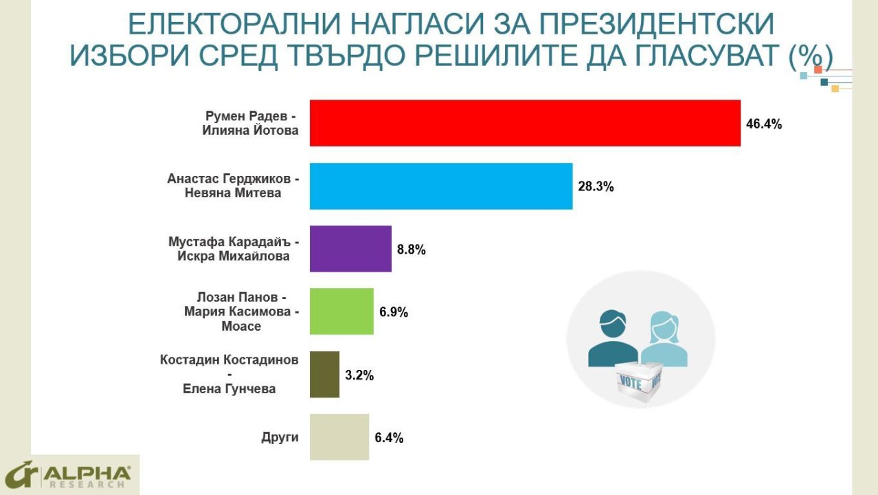 При втори тур балотажът ще е между Румен Радев и Анастас Герджиков. Професорът влиза в последната седмица от кампанията с подкрепа от 28.3%, която идва основно от симпатизанти на ГЕРБ-СДС, представители на интелигенцията, свободни професии и академични кръгове.