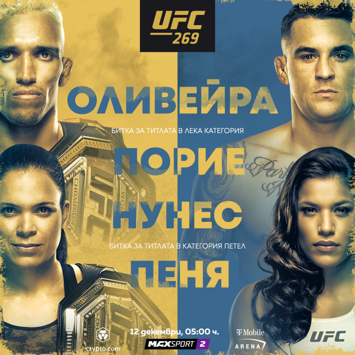 Втората битка за титла ще е при жените в категория петел. В нея Аманда Нунес ще опита да направи поредна защита на пояса си срещу Джулиана Пеня. UFC 269 ще се проведе в Лас Вегас, а зрителите ще могат да го гледат по MAX Sport 2 в неделя от 05:00 часа сутринта.