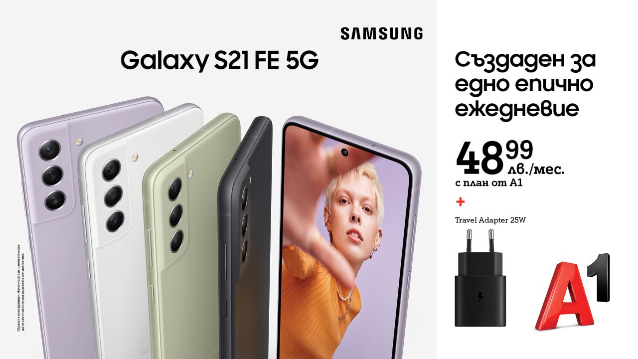 Samsung Galaxy S21 FE 5G вече може да бъде закупен от магазините на А1 и онлайн на А1.bg. Цените му започват от 999,99 лева при закупуване в брой с тарифен план Unlimited Ultra. При покупка на лизинг, стойността на устройството възлиза на 48,99 лева на месец за двугодишния срок на договора.