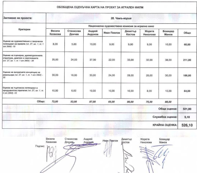 „През 2015 - „Възвишение“ беше почти изхвърлен от Художествената комисия на НФЦ! Разликата беше 0,17 точки. През 2018 г. - „Голата истина за група Жигули“ беше изхвърлен от класирането! Сега дойде време и на „Чамкория“!!! Изхвърлен с разлика от 9 точки от възможни 500+!!!
