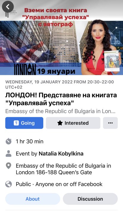 Събитието бе обявено във Facebook профила на Кобилкина, на посолството и в официалния сайт на ръководената от посланик Марин Райков лондонска мисия.