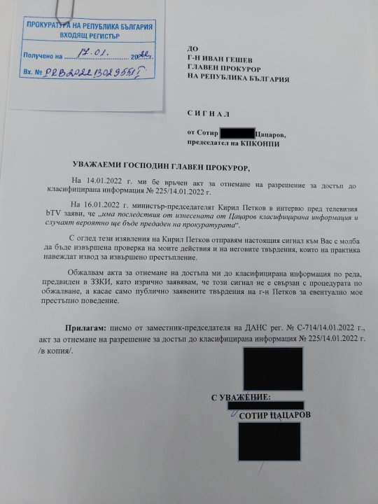 В иска до прокуратурата Цацаров обжалва и акта за отнемане достъпа му до класифицирана информация по реда на закона, като категорично заявява, че „този сигнал не е свързан с процедурата по обжалване, а касае само публично заявените твърдения на г-н Петков за евентуално престъпно поведение“.
