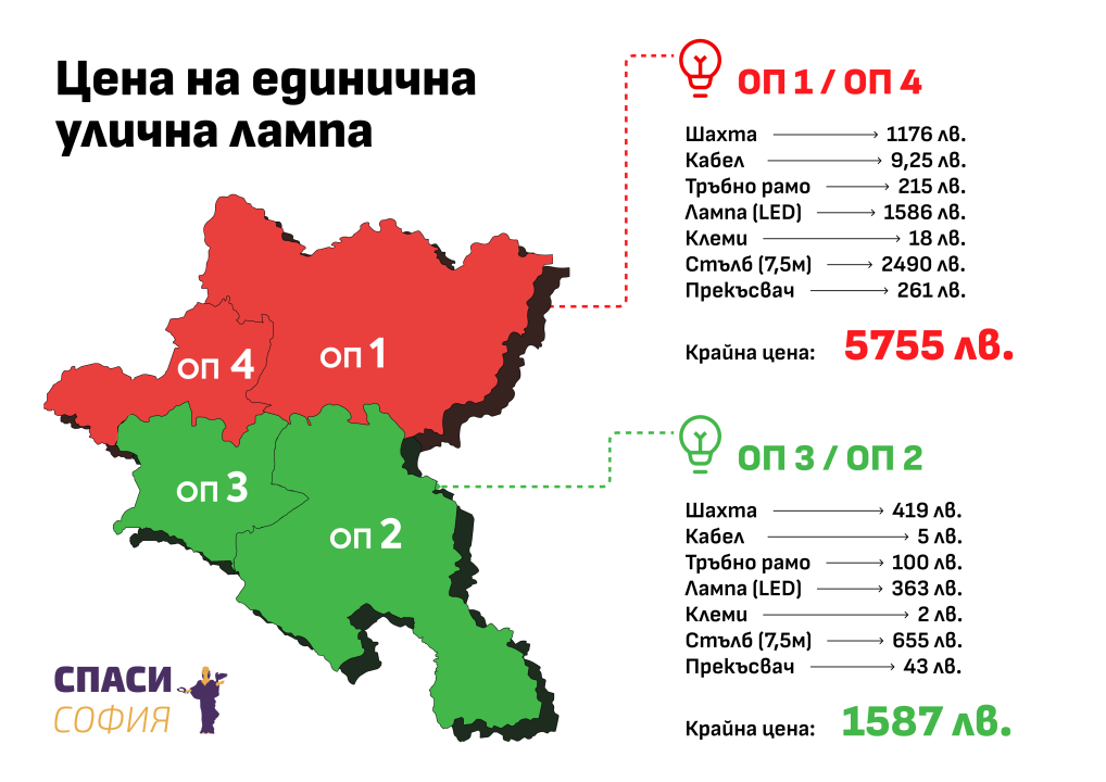„Говорим за едни и същи лампи, не различни. В северна София една лампа ще струва 5755 лева, а в южна София – 1587 лева“, каза Бонев в ефира на bTV. Той даде и фрапиращ пример – границата между зоните на двете фирми е между Президенството и Министерския съвет. От едната страна на тротоара откъм „Дондуков 2“ лампите струват 1578 лева, а от страната на „Дондуков 1“ – същите лампи струват 5755 лева за лампа.
