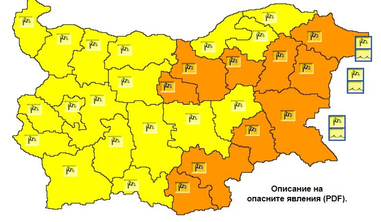 Жълт и оранжев код за опасно силен вятър са обявени в цялата страна. Поривите на вятъра ще достигат от 20 до 25 м/с.