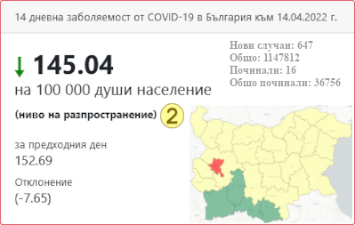 Заболеваемостта в България от COVID-19 на двуседмична база е 145 на сто хиляди души население.