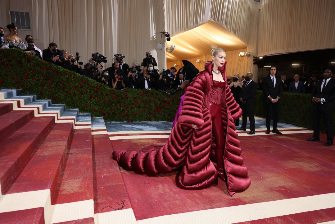 Подобен червен нюанс за пищната си рокля бе избрала и Хилари Клинтън. Същият цвят бе предпочела за огромната си рокля - многоетажно палто-юрган и Джиджи Хадид. Кара Делвин бе избрала също подобен на цвят костюм от сако и впит панталон и под сакото напълно разголен бюст, прикрит от две кръгли пластини.