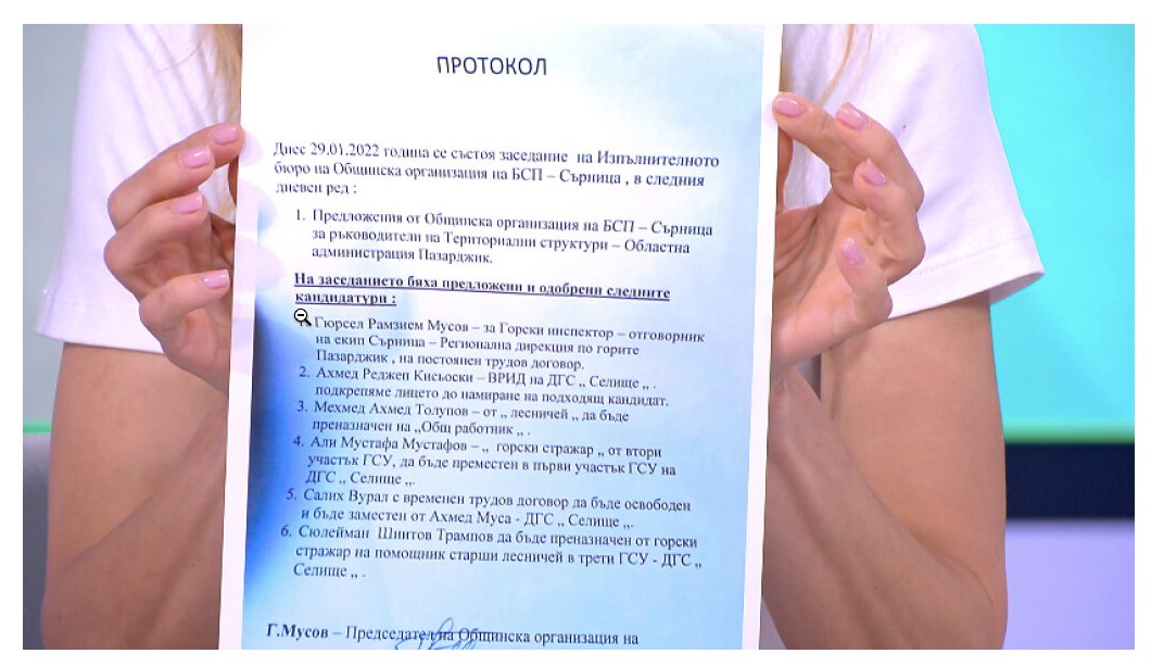 „На 29 януари 2022 г. изпълнителното бюро на една лява партия (б.р. БСП) в село Сърница зам.-председателят г-н (Гюрсел) Мусов и г-н (Венцислав) Перушински са подписали протокол, в който г-н Гюрсел Мусов се самопредлага да стане горски инспектор в Регионална дирекция по горите - Пазарджик, която беше моя подчинена структура в Агенцията по горите. На 20 май човекът става горски инспектор, при условие, че доскоро е бил кандидат-кмет, партиен функционер, бизнесмен и няма нищо общо с горите. И къде ще проверява в Сърница, кой ще проверява фирмите, които се отчитат на партиите, които имат отношение към горите. Вторият, който се е подписал под документа пък е горски стражар от половин година, той е назначен без никакъв опит“, разказа той и допълни, че всички хора са роднини и ще стане една „страшна каша“ в Сърница.