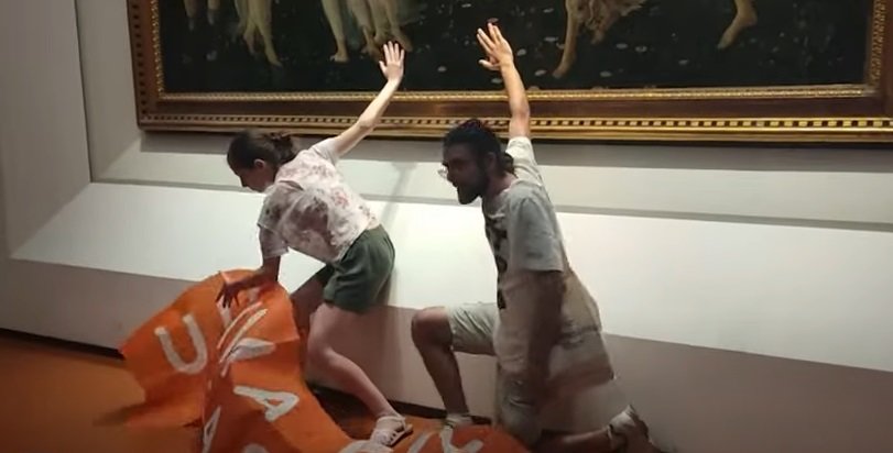 Двама протестиращи залепиха дланите си върху експоната в галерия „Уфици“ като предварително разпънаха плакат с надпис „Ultima Generazione No Gas No Carbone (Последно поколение, без газ, без въглища)“.