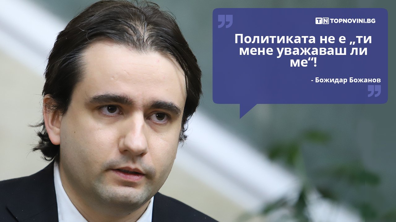 Политиката не е шоу, а отговорност за съдбата на страната. Не е „ти мене уважаваш ли ме“, а „какво да направим за страната заедно“. Не е вземане на решения от диванчета, зайчарници и сараи, а диалог пред хората. Така министърът на електронното управление Божидар Божанов от ДБ коментира провала на третия мандат за съставяне на правителство.