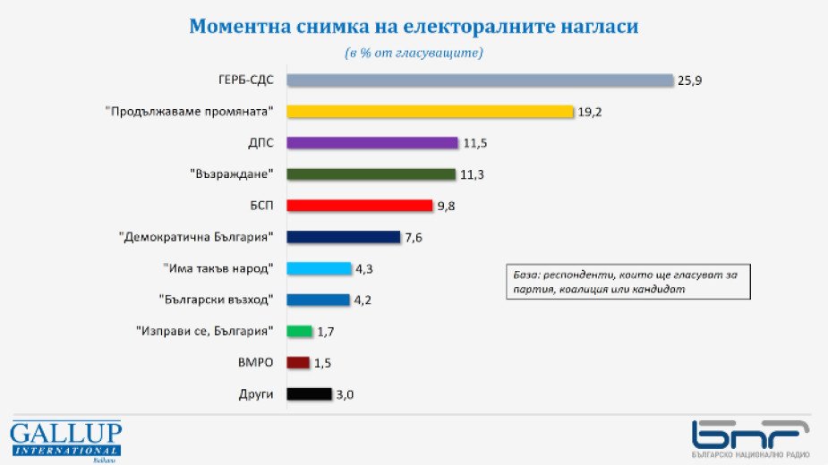 Изводите са от национално представително изследване на „Галъп интернешънъл болкан“ за Българското национално радио - поръчано и финансирано от обществената медия и проведено между 2 и 10 септември сред 1002 пълнолетни българи чрез пряко интервю с таблети „лице в лице“.