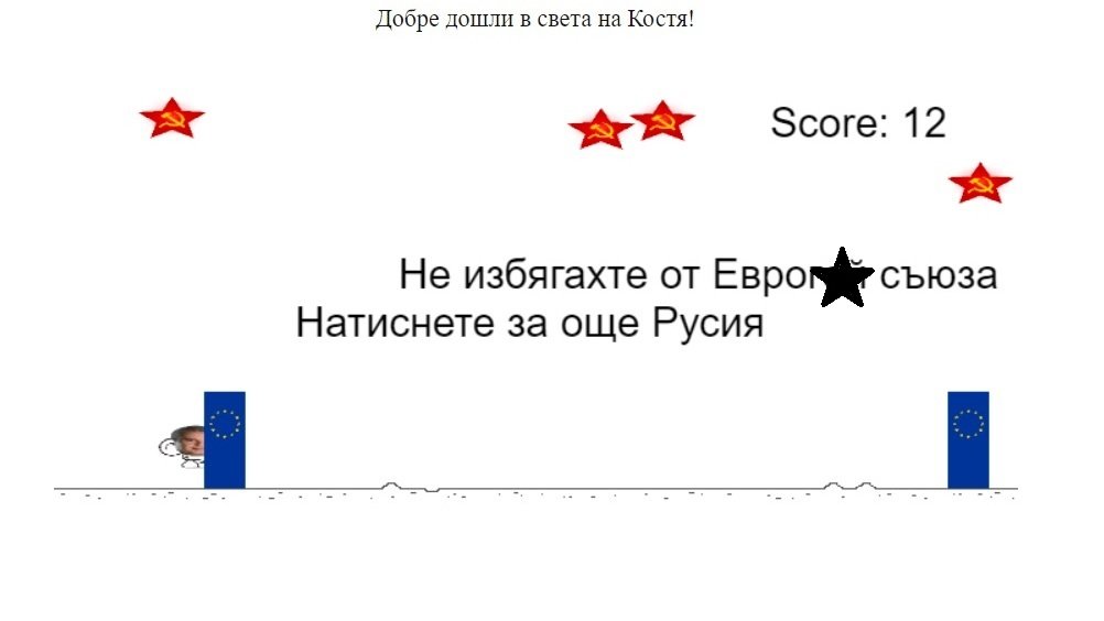 Целта на играта е играчът да помогне на „Костя“ да избяга от Европейския съюз, като прескача сини стълбчета със знамето на съюза. Героят се управлява само с бутона „Space” на клавиатурата, а когато се удари в някой стълб, на екрана се показва нецензурно съобщение. Ако искате да започнете отново, пак трябва да натиснете „Space”.