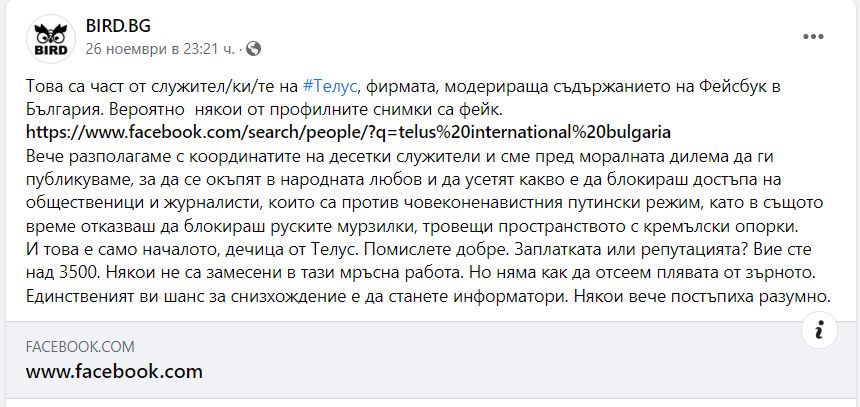 Миналата година официално излезе информация, че TELUS са наети от Facebook да модерират съдържанието на българските потребители в платформата.