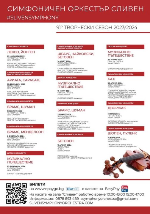 Повече информация относно програмата за новия творчески сезон може да бъде открита на официалния сайт на симфоничния оркестър: WWW.SLIVENSYMPHONYORCHESTRA.COM