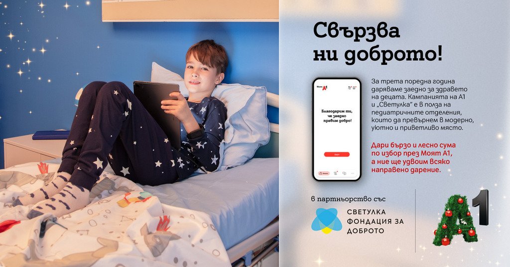 С третото издание на коледната кампания с кауза в Моят А1 компанията продължава своята подкрепа към проект „Светулка“. Тазгодишното издание на „Свързва ни доброто: Дари за здравето на децата, А1 ще удвои“ отново е насочено към частните абонати на А1, които имат възможност да дарят сума по избор през приложението Моят А1 или уеб версията му. А1 ще превърне всеки жест в двойно повече добро, като удвои всяко направено дарение за своя сметка. Набраните средства ще бъдат използвани за цялостно обновяване на детско болнично отделение в страната.