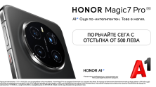 Най-новият флагман HONOR Magic7 Pro вече е наличен за предварителни поръчки от А1. До 4 февруари всеки клиент, закупил своя смартфон от телекома, ще получи 500 лева отстъпка от цената. Устройството се предлага в брой или на лизинг за 24 или 36 месеца с планове Unlimited.
