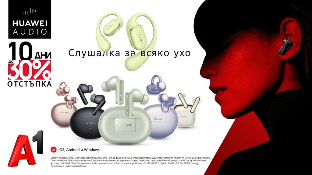 До 20 април А1 предлага специална селекция безжични слушалки Huawei с до 30% отстъпка при покупка в брой или на лизинг с план Unlimited Ultra. Пролетта е сезонът на движението и новото начало – перфектен момент да се погрижите за добрия звук, където и да ви отведе денят. Слушалките са съвместими с iOS и Android и съчетават кристално чисто аудио, интелигентни функции и комфорт при продължително носене, което ги прави идеален спътник за активното ежедневие, тренировки или моменти на почивка.