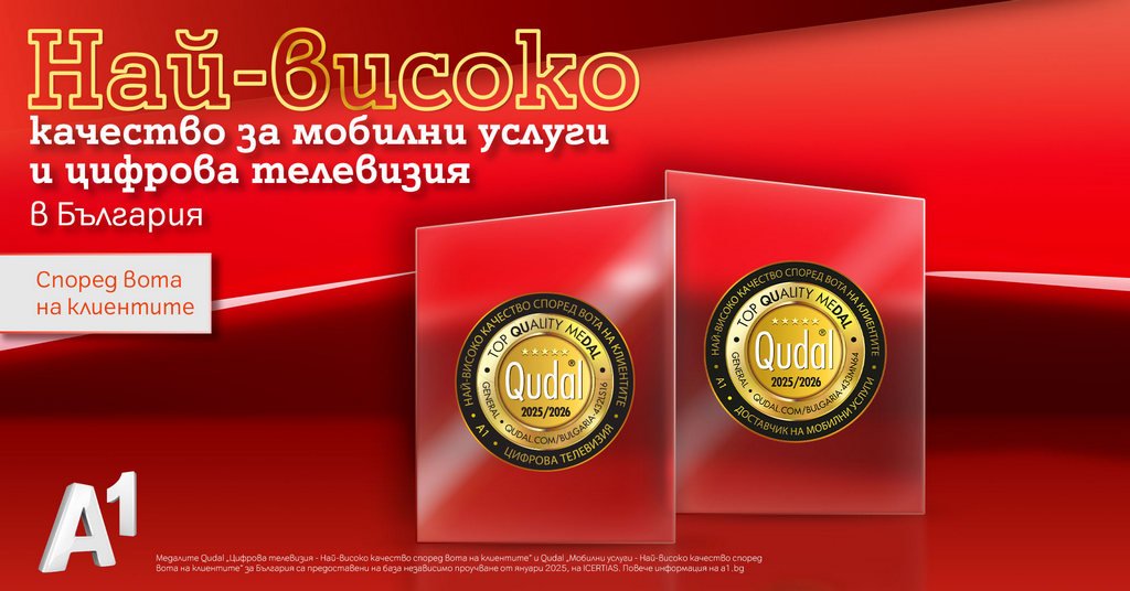 A1 беше отличена с два престижни сертификата QUDAL (QUality meDAL) в категориите „Цифрова телевизия“ и „Мобилни услуги“. Международното признание идва след независимо национално проучване, проведено през януари 2025 г. от сертифициращата организация ICERTIAS (International Certification Association GmbH, Цюрих), в което потребителите оценяват не популярността, а реалното качество на услугите, които използват в ежедневието си.