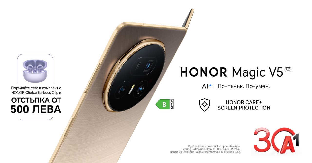 • Поръчайте предварително новия HONOR Magic V5 с 500 лева/255,65 евро отстъпка и в комплект с безжични слушалки до 23:59 ч. на 4 септември.
