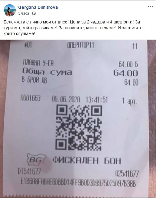 В социалната мрежа "Фейсбук" се появи снимка на касов бон за плажни услуги от курорта "Слънчев бряг".