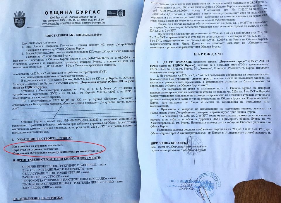 Съпредседателят на „Демократична България“ Христо Иванов публикува във Facebook констативен акт на Община Бургас от 20 август, според който собственикът на имота се задължава да премахне незаконната двуетажна постройка, изградена директно върху плаж „Росенец”.