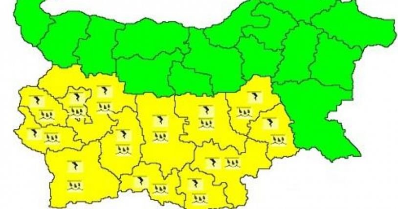 Жълт код за обилни валежи и гръмотевична активност е в сила в 13 области на страната за 6 юни 2018 г, съобщават от Националния институт по метеорология и хидрология (НИМХ) към Българската академия на науките (БАН).